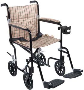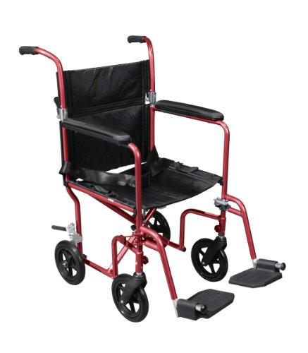 Flyweight Lightweight Aluminum Transport Wheelchair , Color: Burgundy Plaid Seat Size: 17“ Seat8 wheels in front and rear easily remove without tools. Deluxe back release. Deluxe, all aluminum rear wheel locks. Weighs only 19 lbs. 30% less than traditional transport chairs. Aluminum frame for lightweight strength and durability. Composite wheels are lightweight and maintenance free. Comes with carry pocket on back rest. Comes with swing-away footrests. Comes with seat belt for added safety. Soft, plush nylon upholstery. Back folds down for easy storage and transport. Size: 17Primary Color: Burgundy PlaidWeight Capacity: 300lbsUnit of Measure: 1/csProduct photo may not exactly match the product offered for sale. Please refer to the product description.